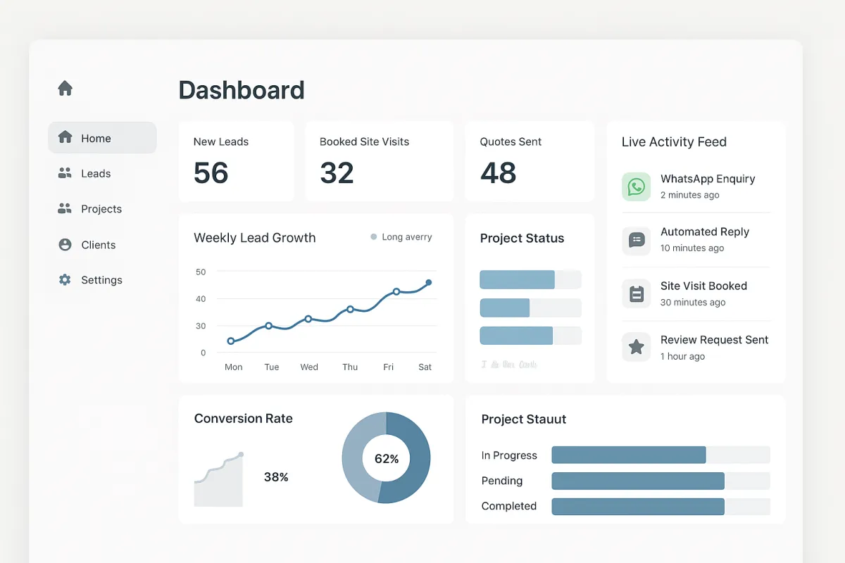 The platform captures every enquiry (WhatsApp, website, ads), responds instantly, books site visits automatically, tracks quotes, and follows up until the job is won. Nothing slips through. More follow-ups = more closed jobs.